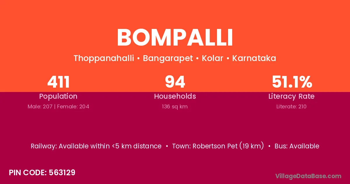 Bidar (22 km) is the nearest town to Bompalli village for major economic activities and is located approximately 22 km away.