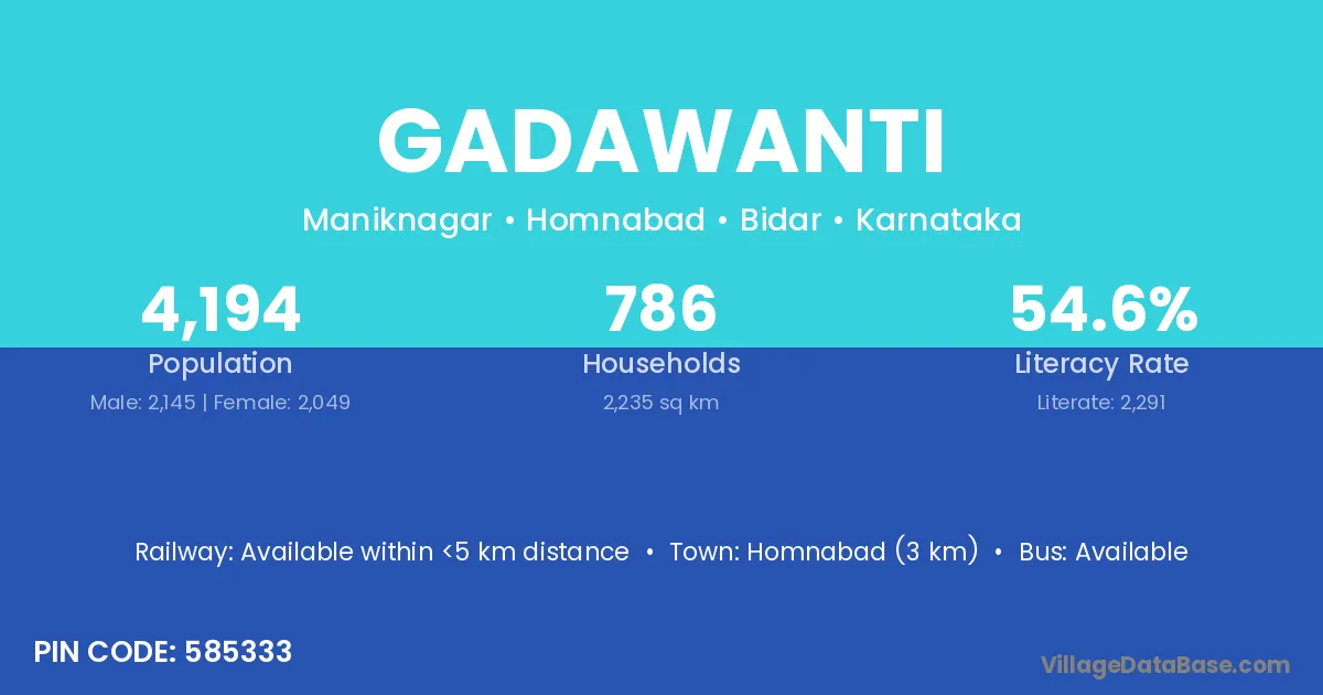 Homnabad (3 km) is the nearest town to Gadawanti village for major economic activities and is located approximately 3 km away.