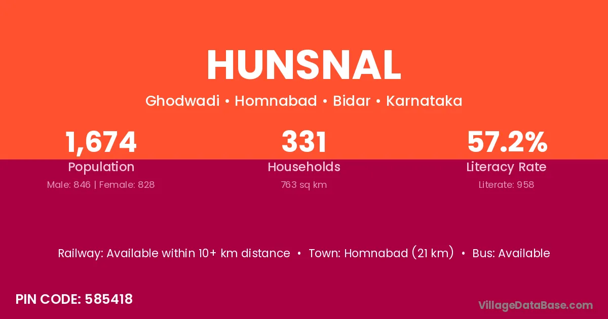 Homnabad (21 km) is the nearest town to Hunsnal village for major economic activities and is located approximately 21 km away.