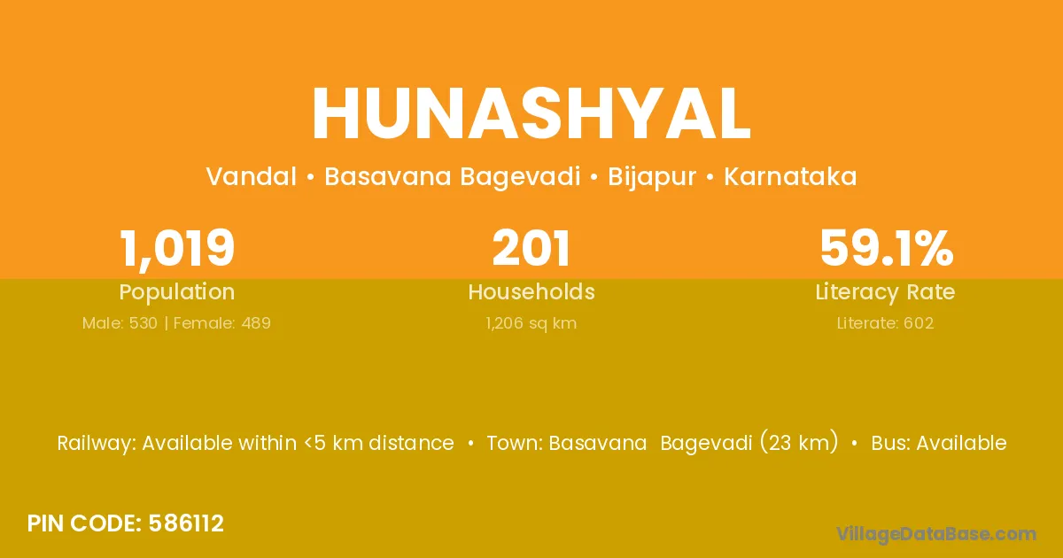 Basavana Bagevadi (23 km) is the nearest town to Hunashyal village for major economic activities and is located approximately 23 km away.