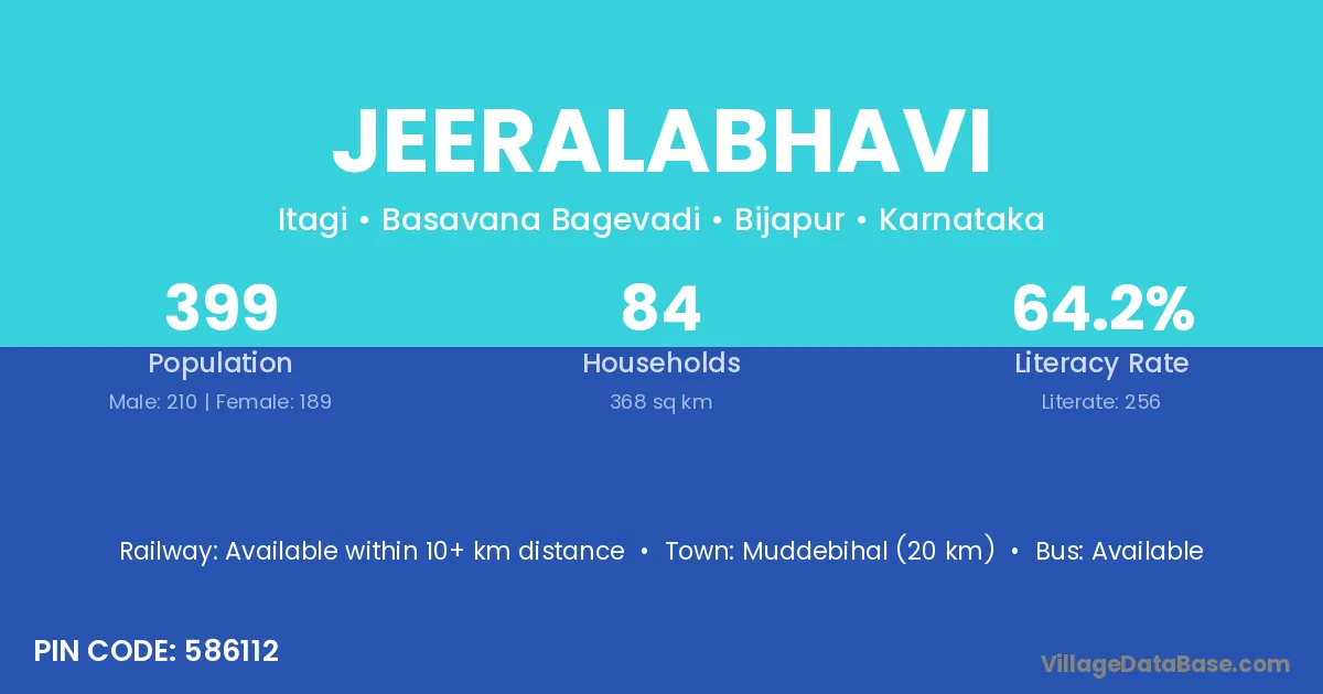 Muddebihal (20 km) is the nearest town to Jeeralabhavi village for major economic activities and is located approximately 20 km away.
