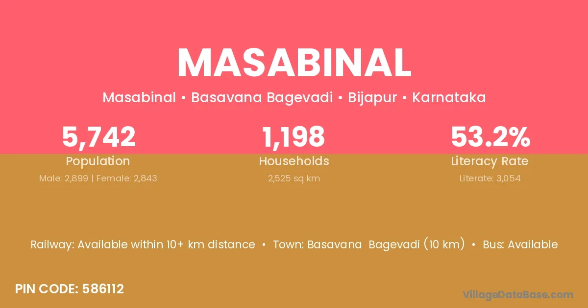 Basavana Bagevadi (10 km) is the nearest town to Masabinal village for major economic activities and is located approximately 10 km away.