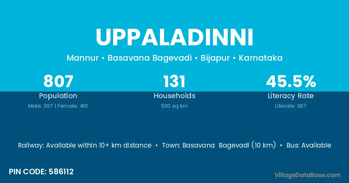 Basavana Bagevadi (10 km) is the nearest town to Uppaladinni village for major economic activities and is located approximately 10 km away.