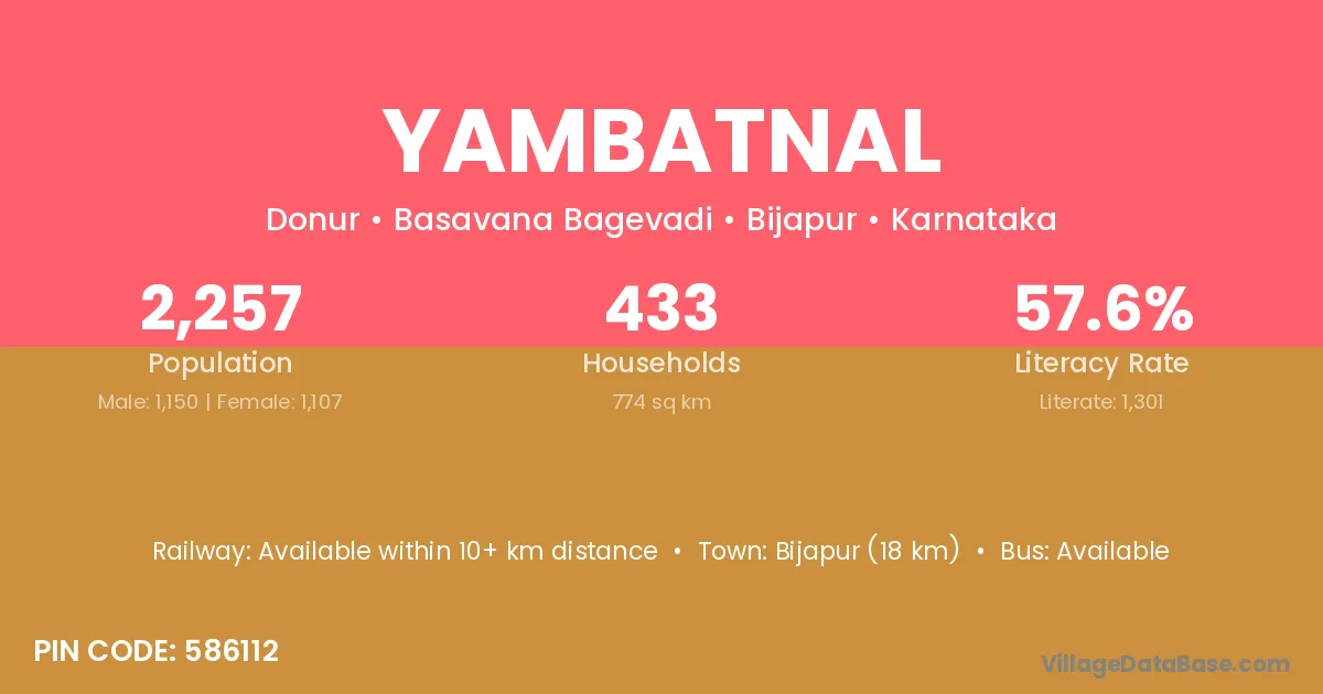 Bijapur (18 km) is the nearest town to Yambatnal village for major economic activities and is located approximately 18 km away.