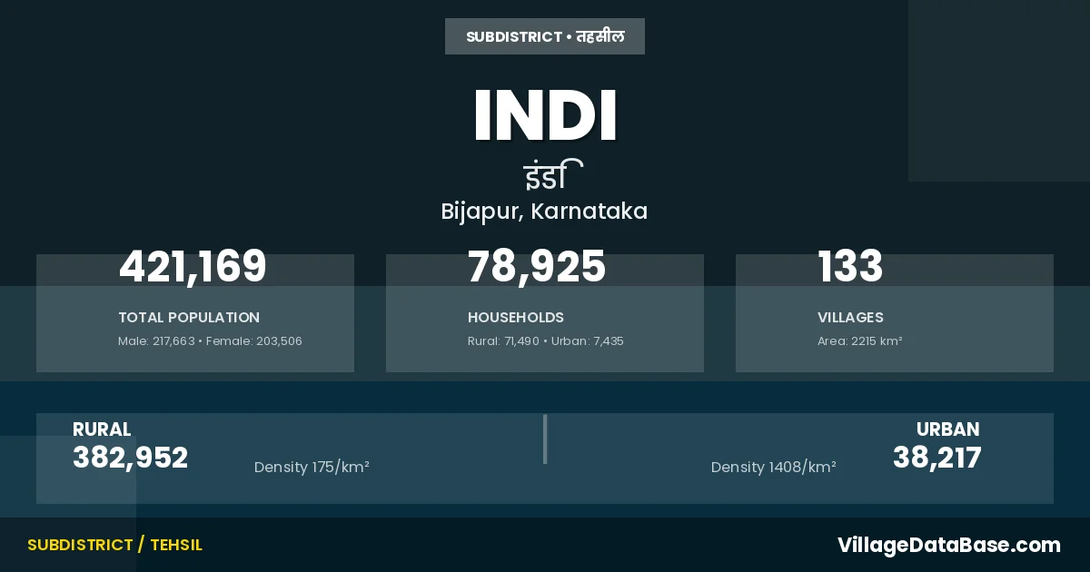 According to the 2011 census The total area of Indi Taluka is 2215 km², with a population of 421169 people. The population density is 190 inhabitants per square kilometre, and there are approximately 78925 houses in the sub district.