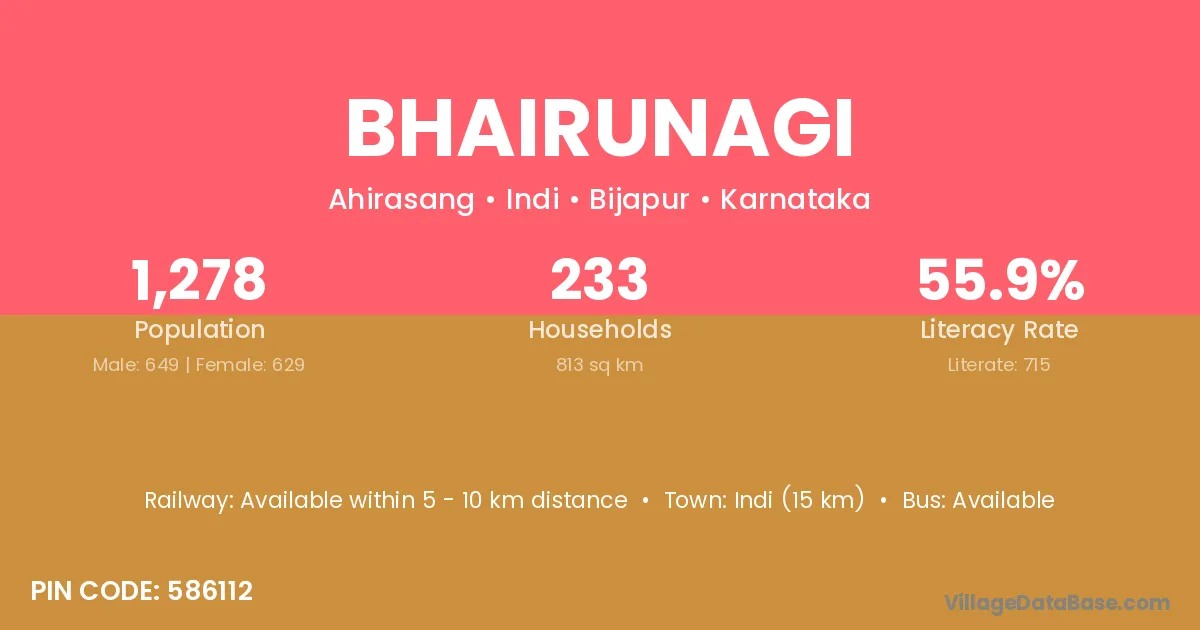 Indi (15 km) is the nearest town to Bhairunagi village for major economic activities and is located approximately 15 km away.