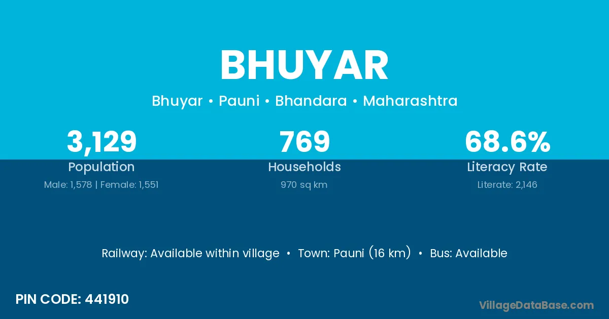 The literacy rate of Bhuyar village is 49.86%. Male literacy stands at 58.01% and female literacy at 40.99%.