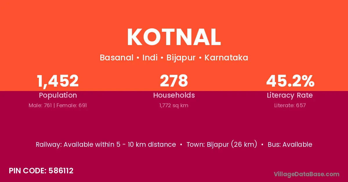 Bijapur (26 km) is the nearest town to Kotnal village for major economic activities and is located approximately 26 km away.