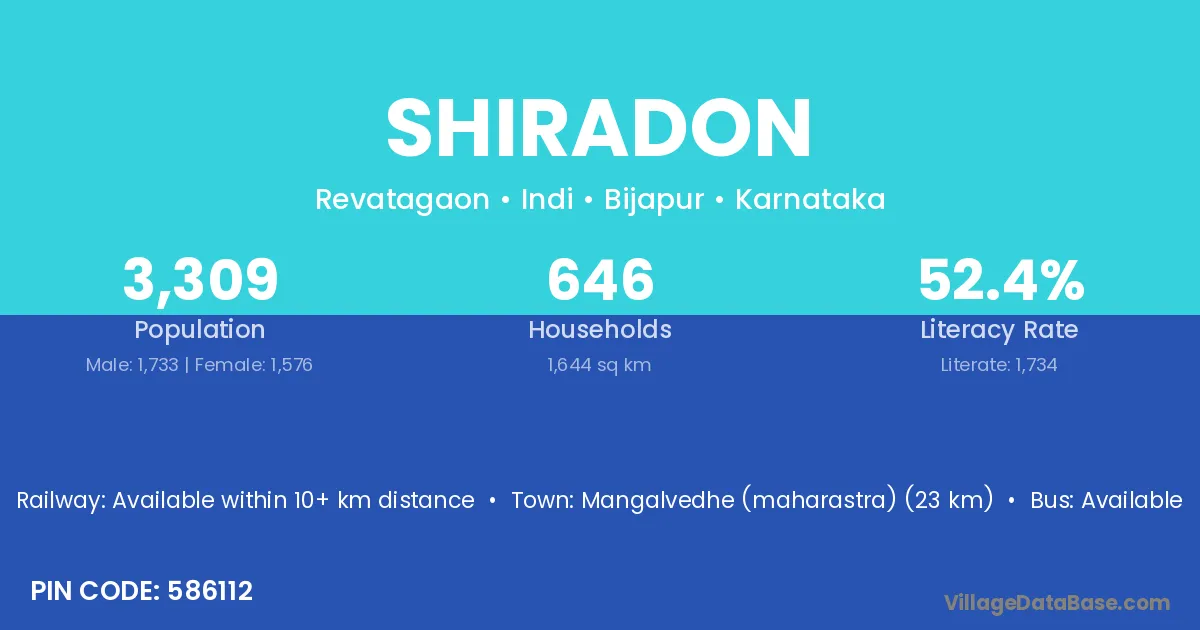 Mangalvedhe (maharastra) (23 km) is the nearest town to Shiradon village for major economic activities and is located approximately 23 km away.