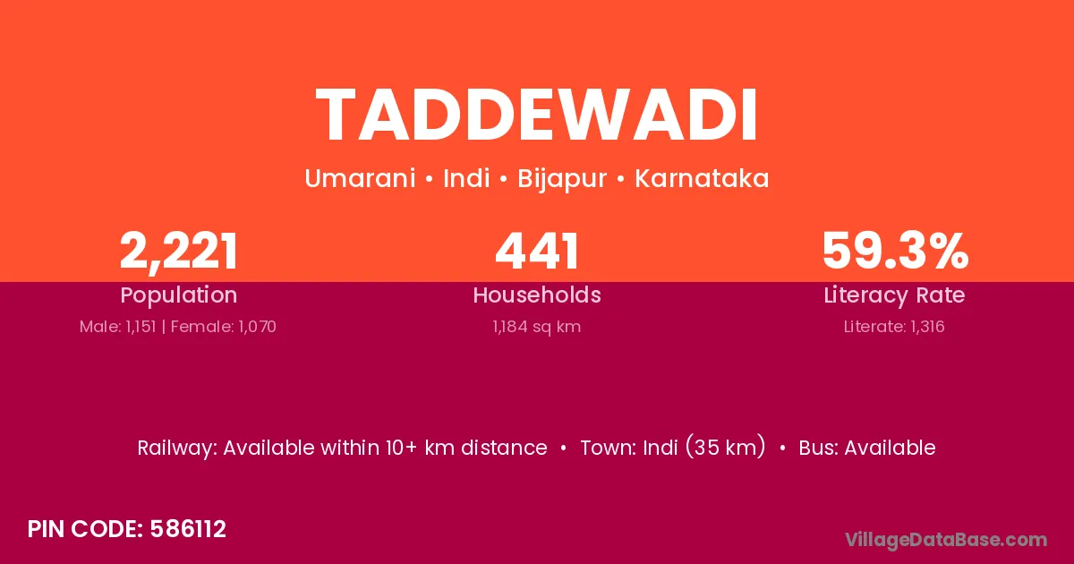 Indi (35 km) is the nearest town to Taddewadi village for major economic activities and is located approximately 35 km away.