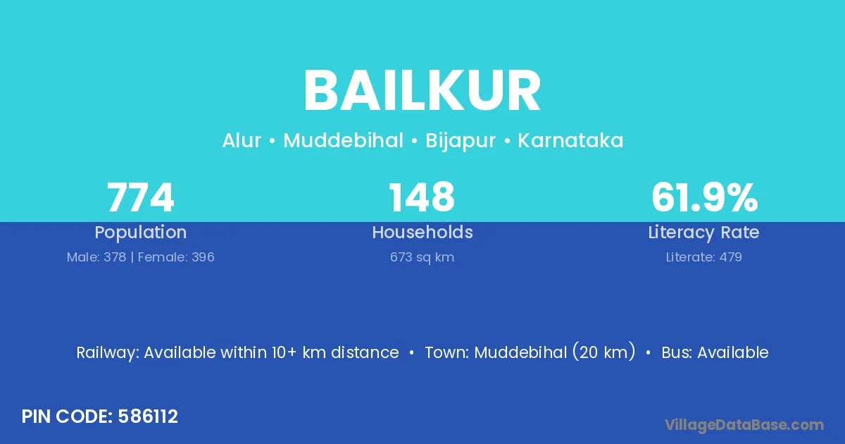 Muddebihal (20 km) is the nearest town to Bailkur village for major economic activities and is located approximately 20 km away.
