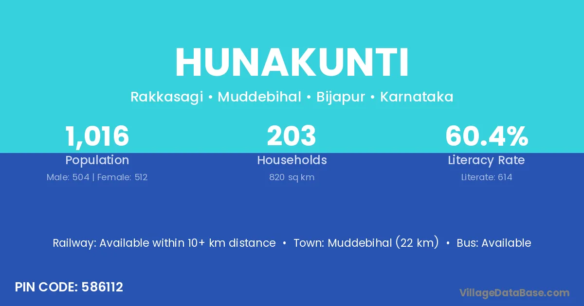Muddebihal (22 km) is the nearest town to Hunakunti village for major economic activities and is located approximately 22 km away.