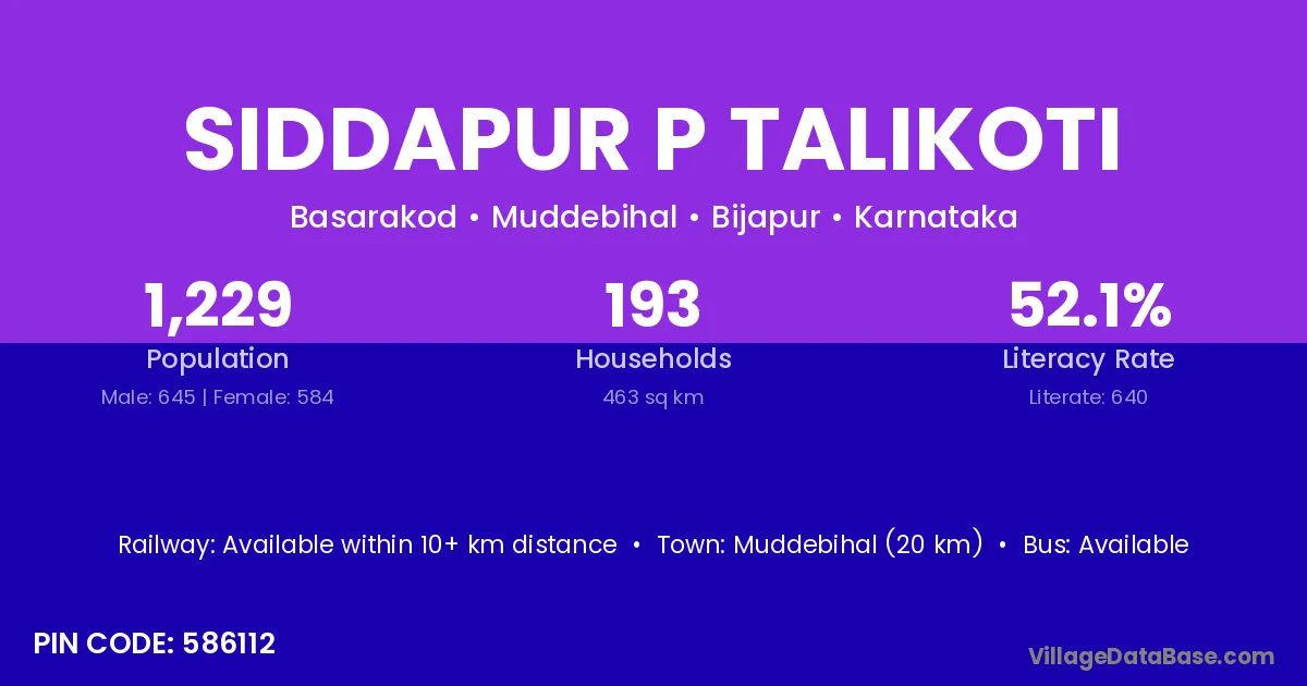Muddebihal (20 km) is the nearest town to Siddapur P Talikoti village for major economic activities and is located approximately 20 km away.