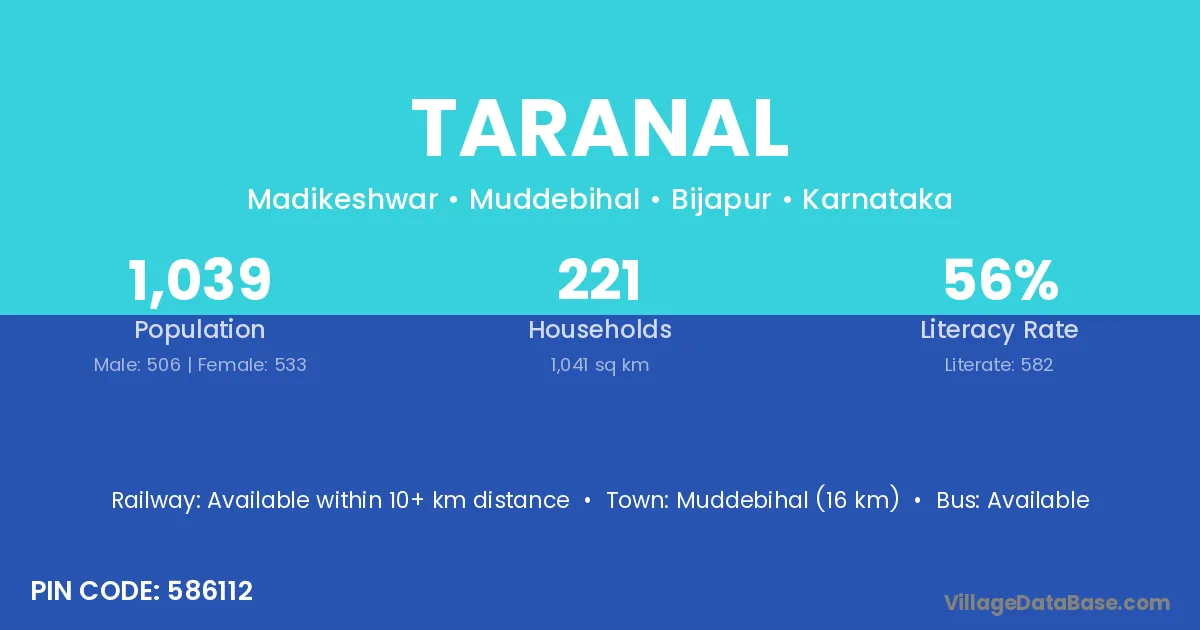 Muddebihal (16 km) is the nearest town to Taranal village for major economic activities and is located approximately 16 km away.