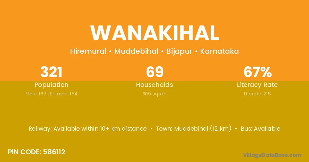 Muddebihal (12 km) is the nearest town to Wanakihal village for major economic activities and is located approximately 12 km away.