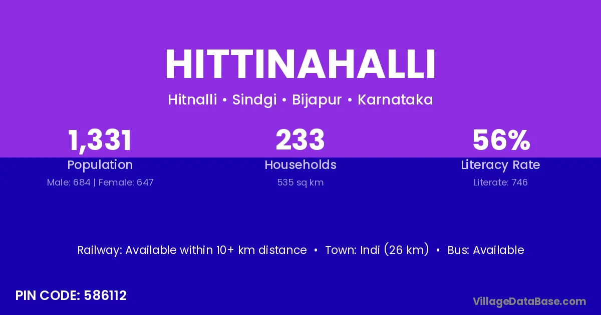 Indi (26 km) is the nearest town to Hittinahalli village for major economic activities and is located approximately 26 km away.