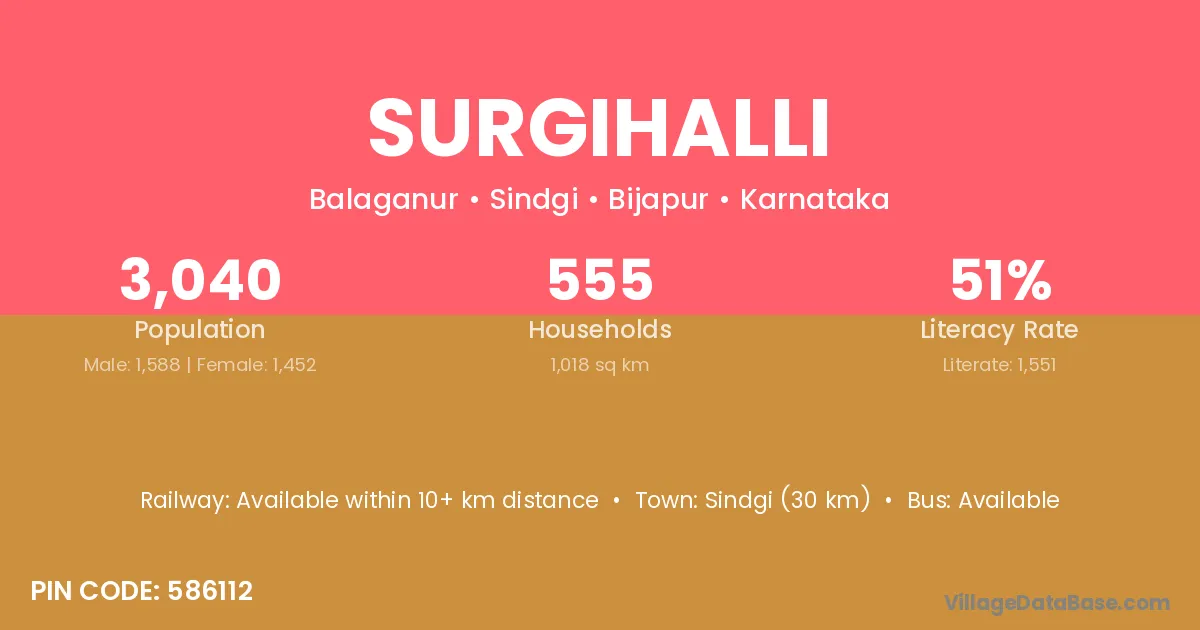 Sindgi (30 km) is the nearest town to Surgihalli village for major economic activities and is located approximately 30 km away.
