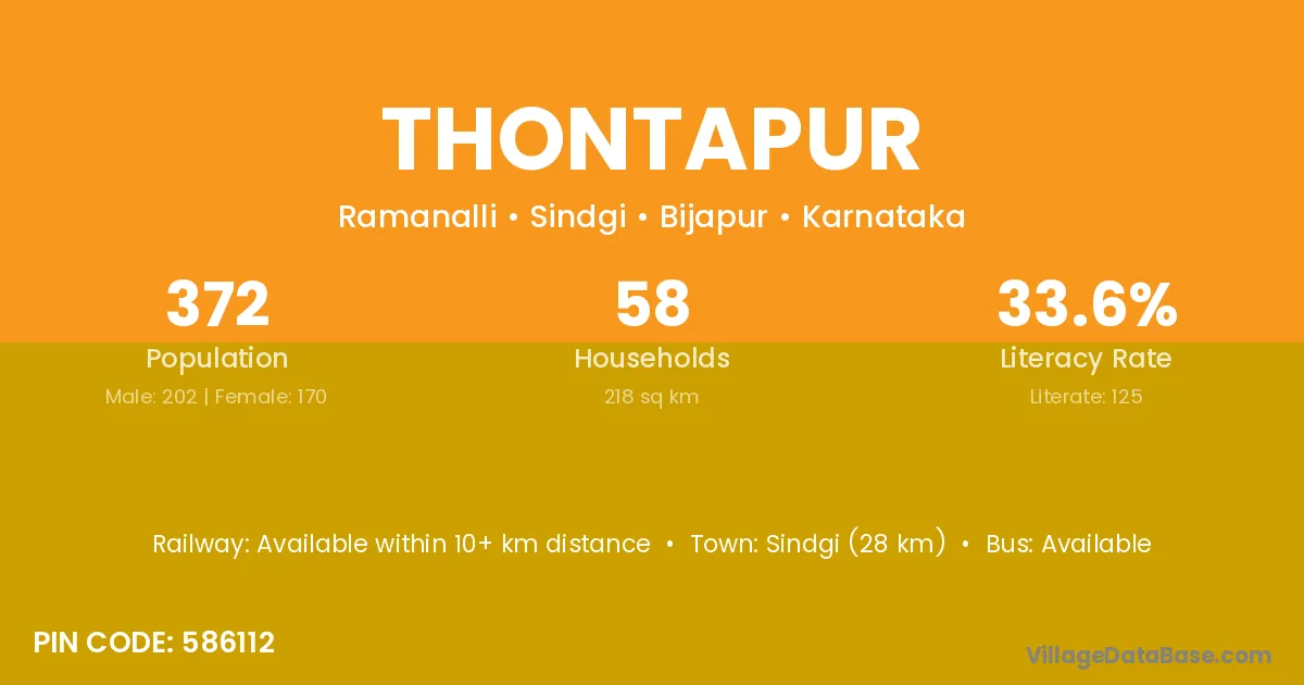 Sindgi (28 km) is the nearest town to Thontapur village for major economic activities and is located approximately 28 km away.