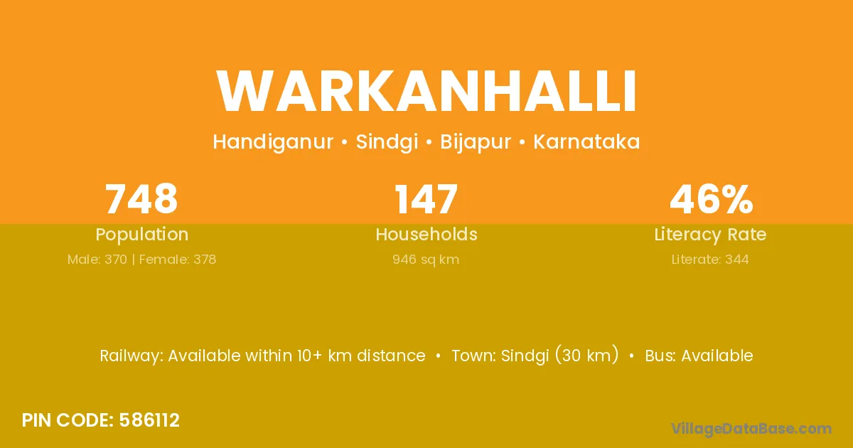 Sindgi (30 km) is the nearest town to Warkanhalli village for major economic activities and is located approximately 30 km away.