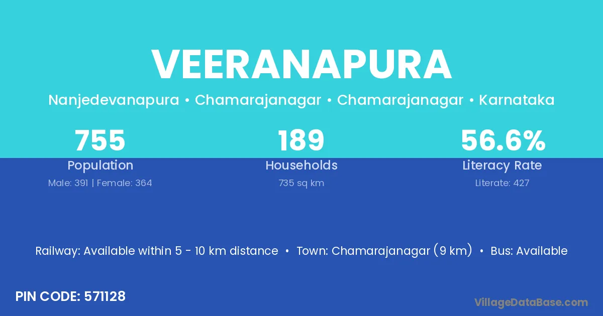 Chamarajanagar (9 km) is the nearest town to Veeranapura village for major economic activities and is located approximately 9 km away.