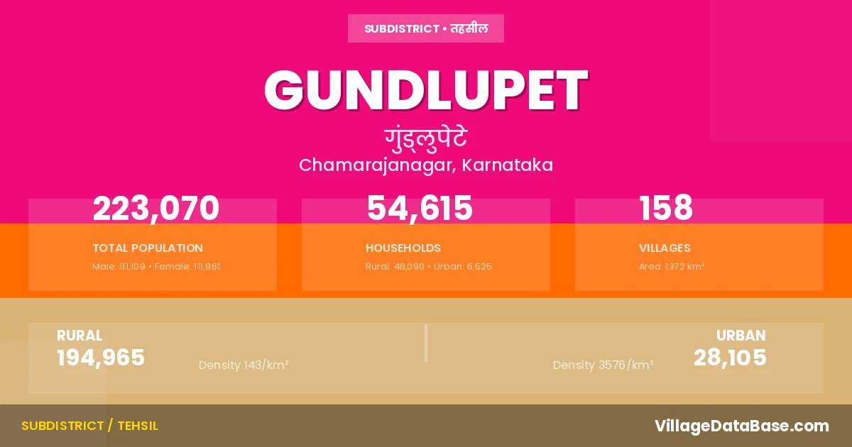 According to the 2011 census The total area of Gundlupet Taluka is 1372 km², with a population of 223070 people. The population density is 163 inhabitants per square kilometre, and there are approximately 54615 houses in the sub district.