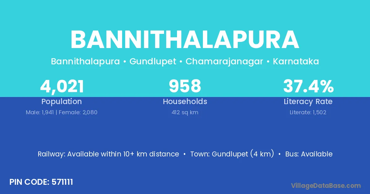 Gundlupet (4 km) is the nearest town to Bannithalapura village for major economic activities and is located approximately 4 km away.