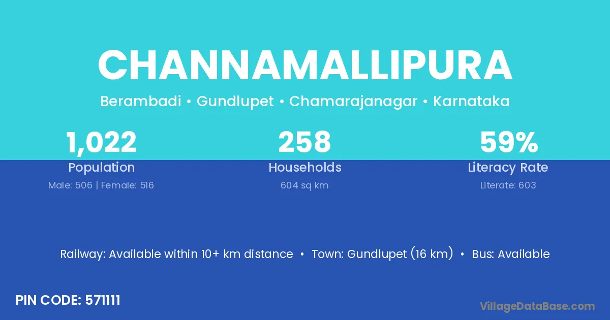 Gundlupet (16 km) is the nearest town to Channamallipura village for major economic activities and is located approximately 16 km away.