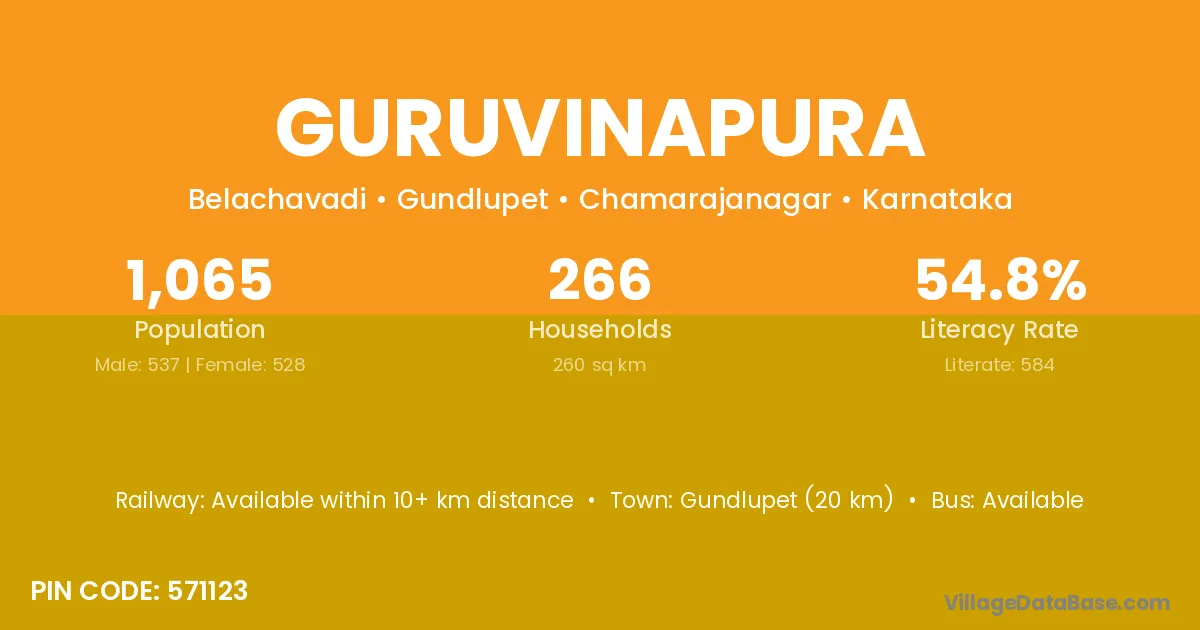 Gundlupet (20 km) is the nearest town to Guruvinapura village for major economic activities and is located approximately 20 km away.
