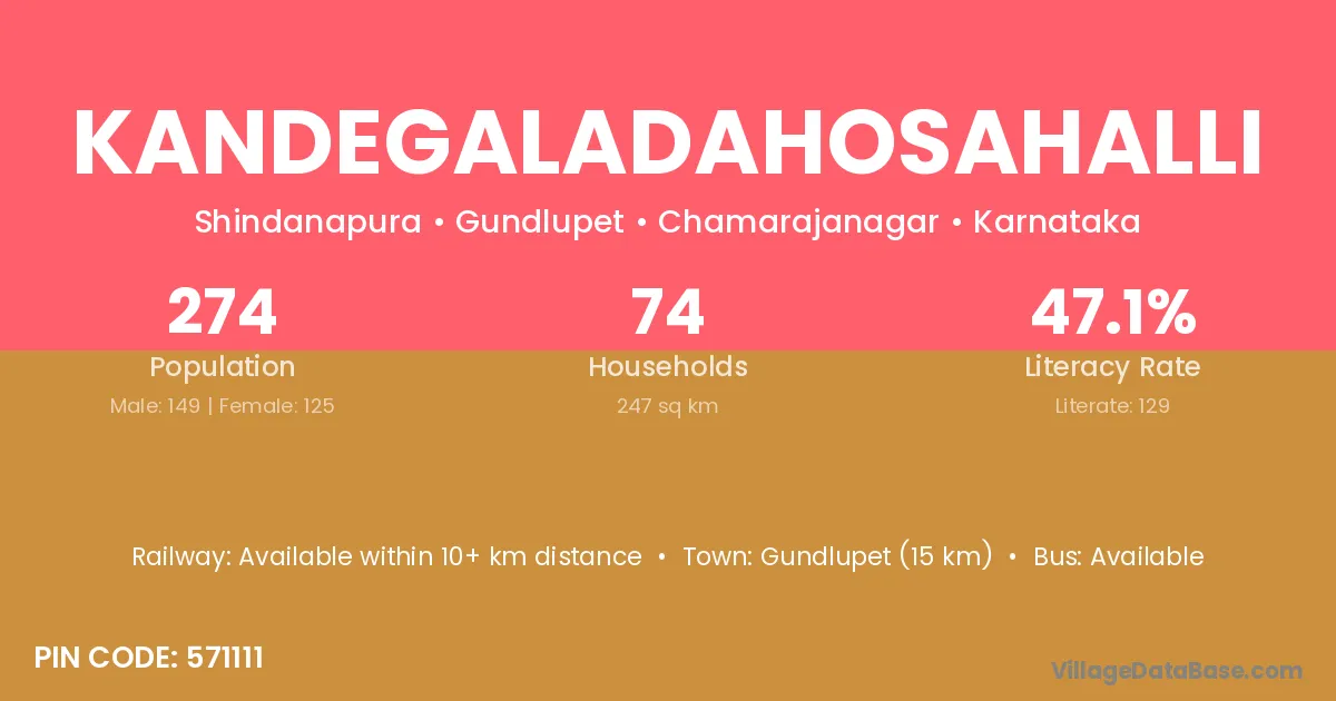 Gundlupet (15 km) is the nearest town to Kandegaladahosahalli village for major economic activities and is located approximately 15 km away.