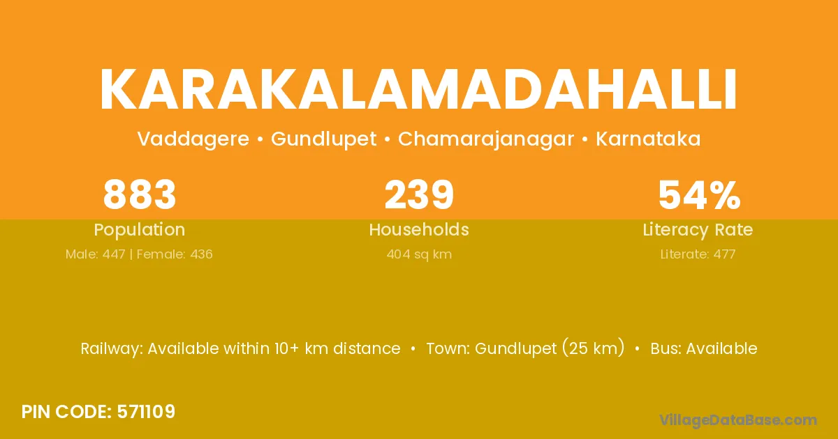 Gundlupet (25 km) is the nearest town to Karakalamadahalli village for major economic activities and is located approximately 25 km away.