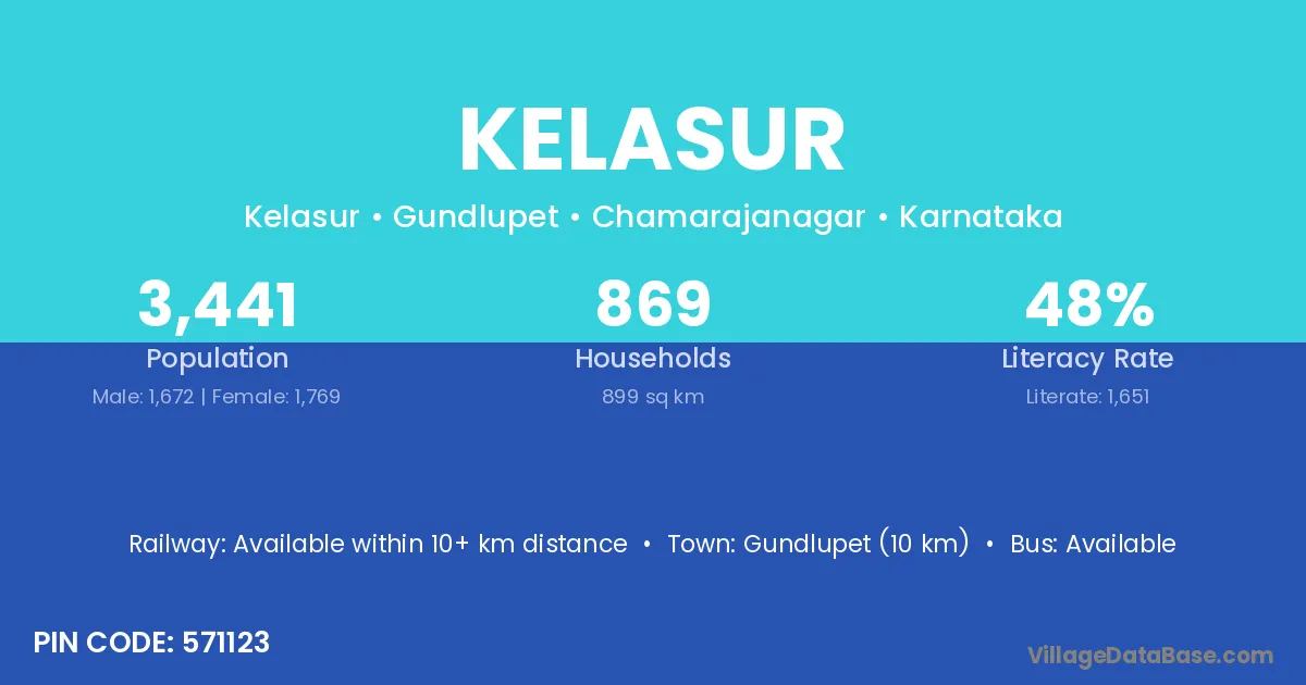 Gundlupet (10 km) is the nearest town to Kelasur village for major economic activities and is located approximately 10 km away.