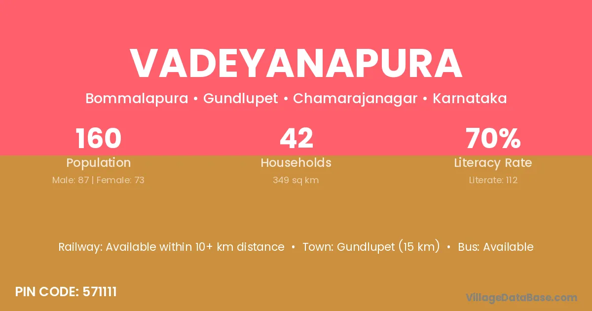 Gundlupet (15 km) is the nearest town to Vadeyanapura village for major economic activities and is located approximately 15 km away.