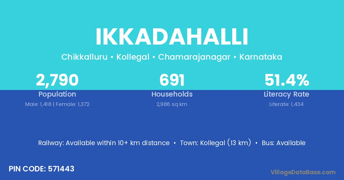 Kollegal (13 km) is the nearest town to Ikkadahalli village for major economic activities and is located approximately 13 km away.