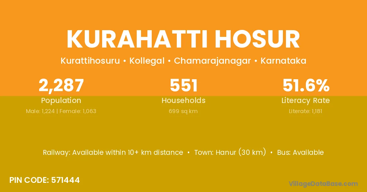 Hanur (30 km) is the nearest town to Kurahatti Hosur village for major economic activities and is located approximately 30 km away.