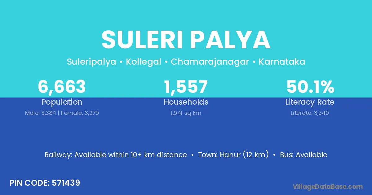Suleri Palya village has a total population of 6,663 people, of which 3,384 are males and 3,279 are females.