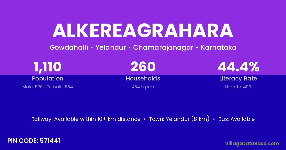 Yelandur (8 km) is the nearest town to Alkereagrahara village for major economic activities and is located approximately 8 km away.
