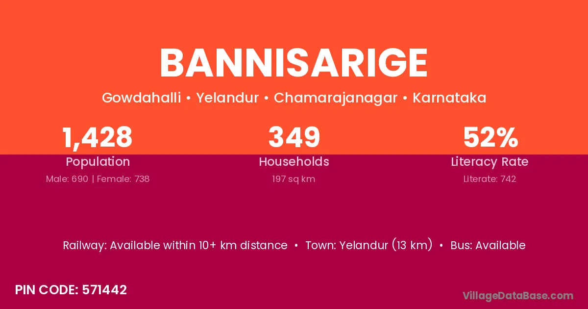 Yelandur (13 km) is the nearest town to Bannisarige village for major economic activities and is located approximately 13 km away.