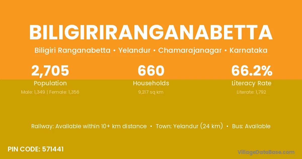 Yelandur (24 km) is the nearest town to Biligiriranganabetta village for major economic activities and is located approximately 24 km away.