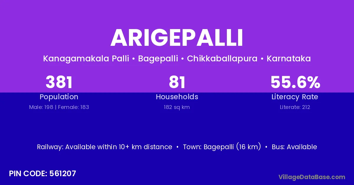 Bagepalli (16 km) is the nearest town to Arigepalli village for major economic activities and is located approximately 16 km away.