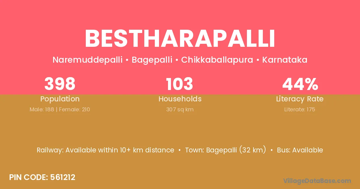 Bagepalli (32 km) is the nearest town to Bestharapalli village for major economic activities and is located approximately 32 km away.