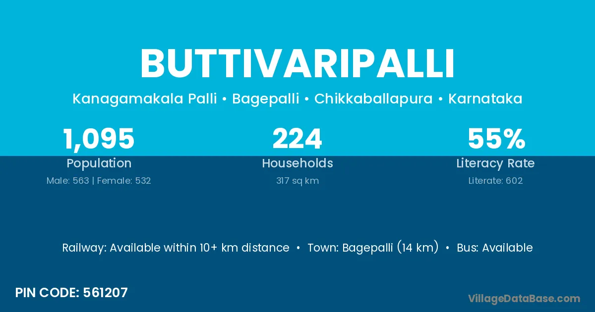 Bagepalli (14 km) is the nearest town to Buttivaripalli village for major economic activities and is located approximately 14 km away.