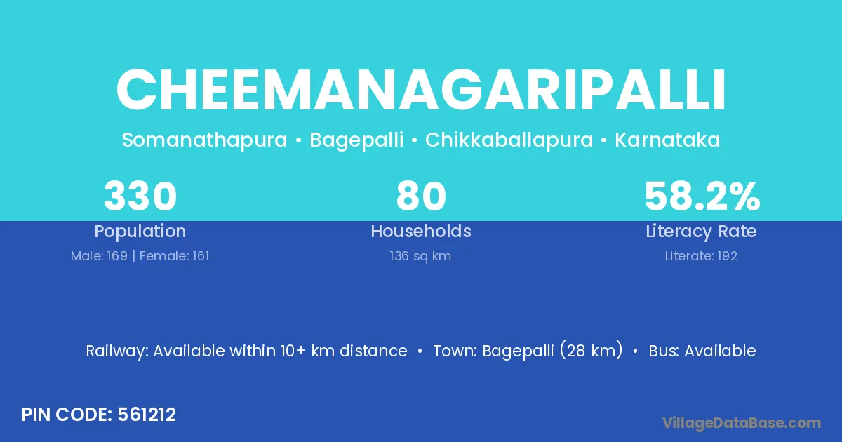 Bagepalli (28 km) is the nearest town to Cheemanagaripalli village for major economic activities and is located approximately 28 km away.