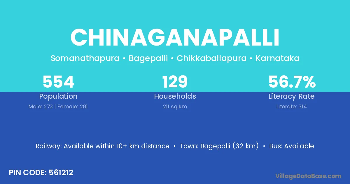Bagepalli (32 km) is the nearest town to Chinaganapalli village for major economic activities and is located approximately 32 km away.