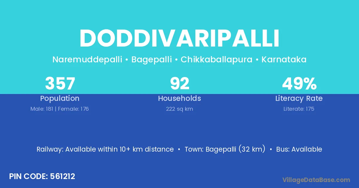 Bagepalli (32 km) is the nearest town to Doddivaripalli village for major economic activities and is located approximately 32 km away.
