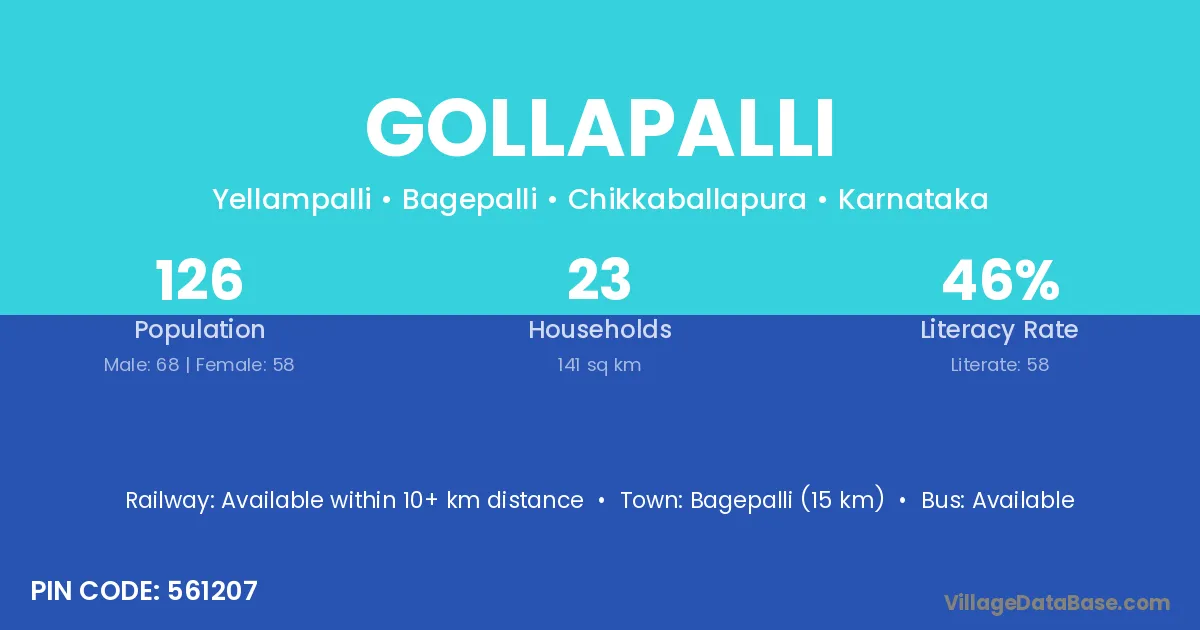 Bagepalli (15 km) is the nearest town to Gollapalli village for major economic activities and is located approximately 15 km away.