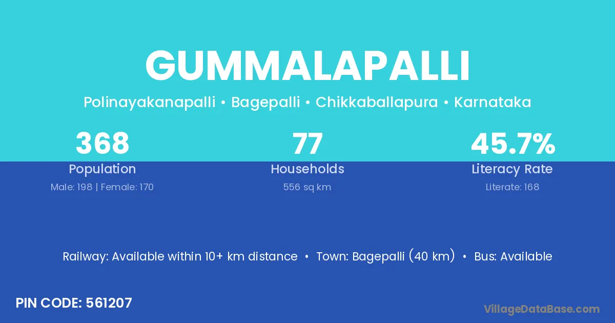 Bagepalli (40 km) is the nearest town to Gummalapalli village for major economic activities and is located approximately 40 km away.