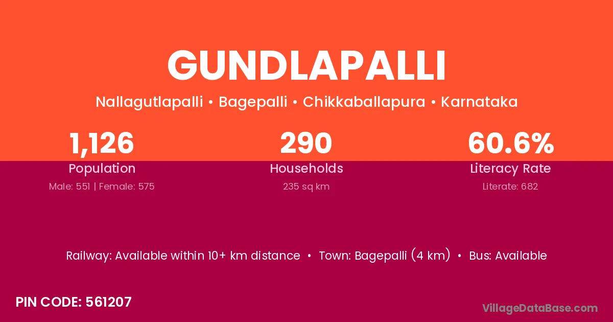 Bagepalli (4 km) is the nearest town to Gundlapalli village for major economic activities and is located approximately 4 km away.