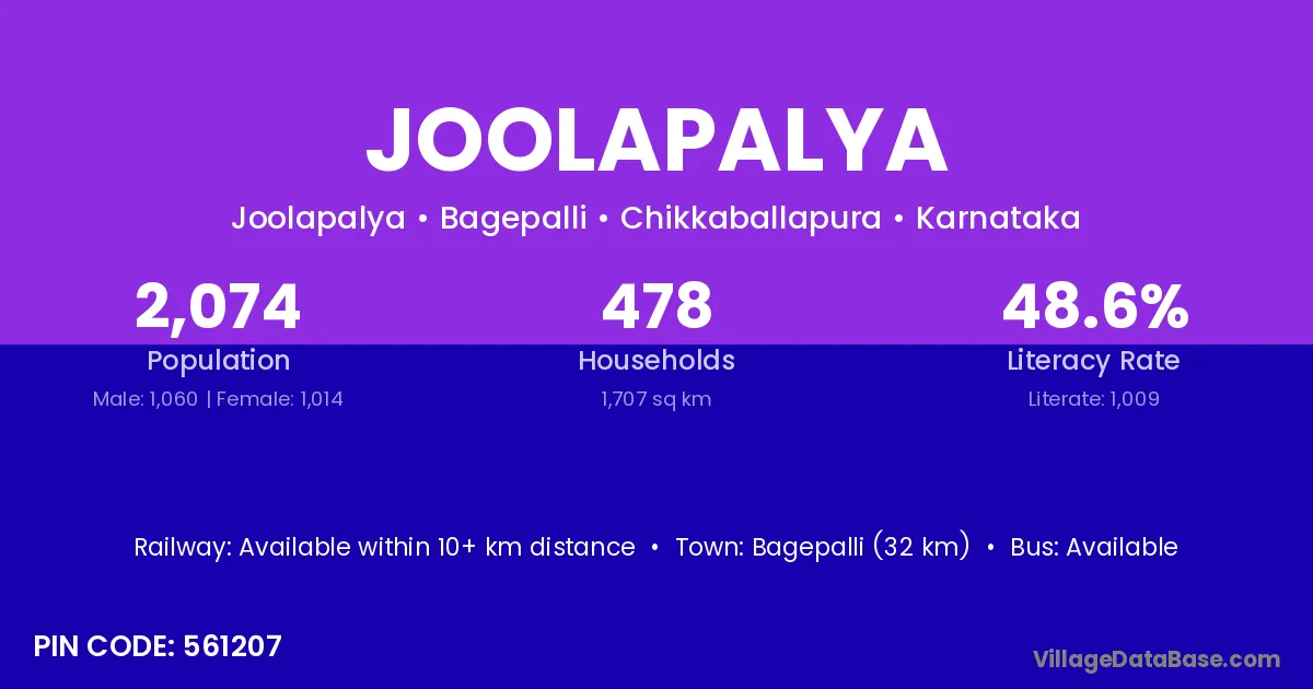 Bagepalli (32 km) is the nearest town to Joolapalya village for major economic activities and is located approximately 32 km away.