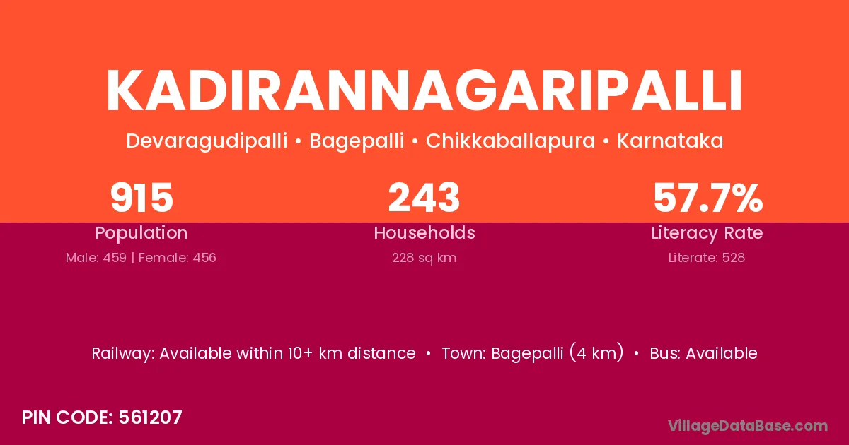 Bagepalli (4 km) is the nearest town to Kadirannagaripalli village for major economic activities and is located approximately 4 km away.
