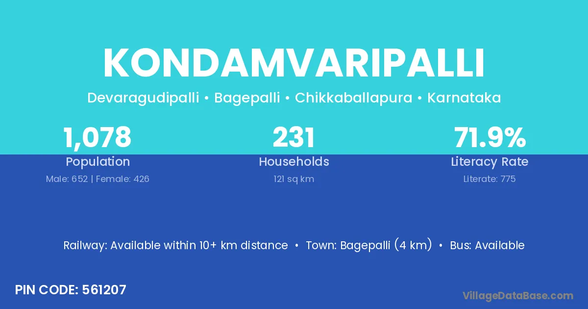 Bagepalli (4 km) is the nearest town to Kondamvaripalli village for major economic activities and is located approximately 4 km away.